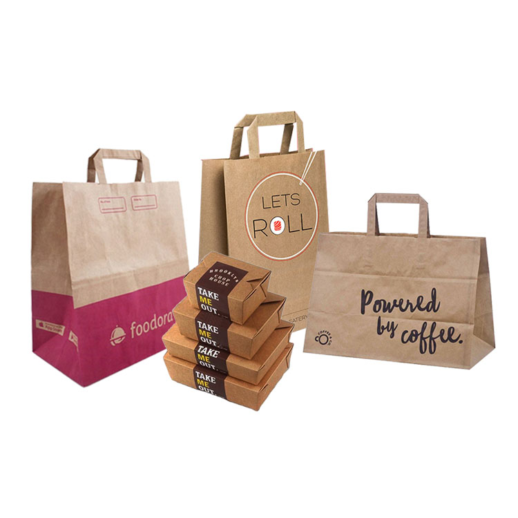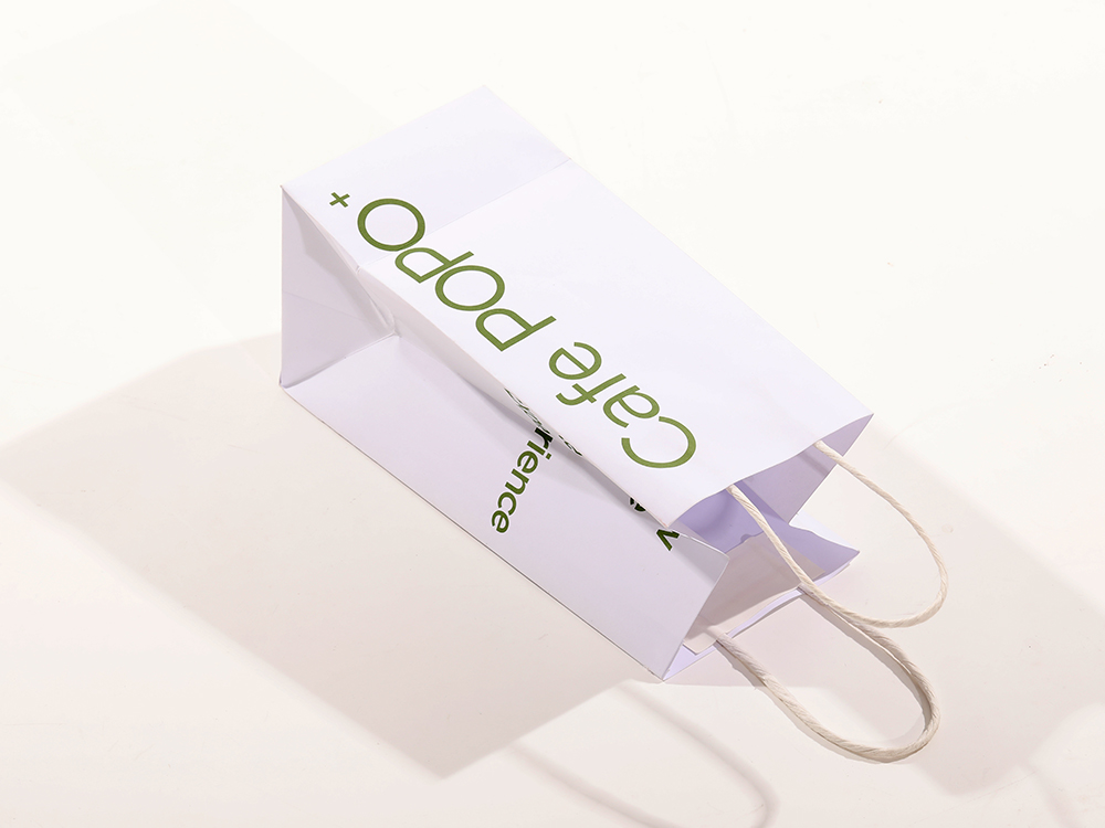 Printed premium paper bags with flat handles. Available in premium white or brown kraft paper. Ideal for cafes, takeaway outlets, catering outlets and other retail stores.